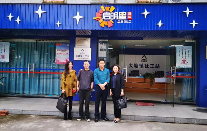 佛山市禁毒协会秘书长黄勰、副秘书长王毅坚与三水区禁毒协会副秘书长、广东98彩网特卫集团总经办主任邓淑芬在社工服务站前留影