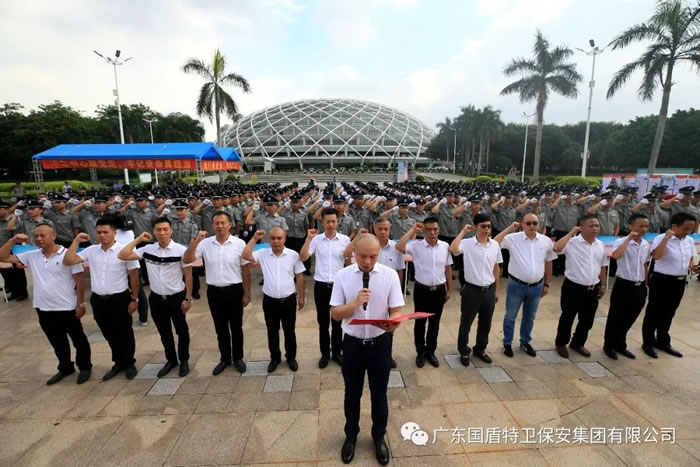 98彩网特卫保安集团与全市保安代表一起庄严宣誓:“对党忠诚、服务人民、履职尽责,不忘初心、牢记使命,以高标准、必胜信心、全力以赴、顽强拼搏,为新中国成立70周年安保任务,努力奋斗!” ——宣誓人:广东98彩网特卫保安集团有限公司全体保安员。