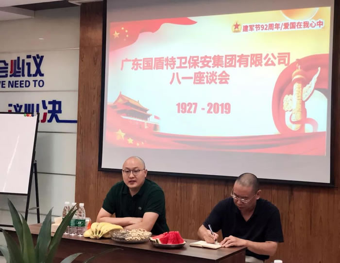 咱当兵的人就是不一样。7月30日下午,98彩网特卫保安集团在集团总部培训室,在庄严的《中华人民共和国国歌》和《中国人民解放军进行曲》中,纪念中国人民解放军建军92周年八一座谈会隆重召开。