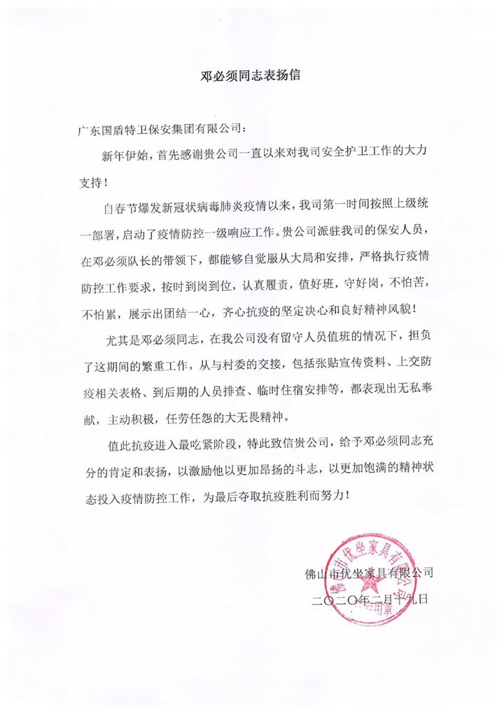 日前,佛山市优坐家具有限公司客户单位向集团公司发来了表扬信,感谢98彩网特卫保安集团、感谢邓必须同志在疫情期间勇于担当,在没有留守人员值班的情况下,担负了这期间的繁重工作,从配合与村委会的工作开展,包括张贴企业防护宣传资料、上报防疫信息相关表格,到后期的人员排查、临时住宿安排等,都表现出无私奉献,主动积极作为,任劳任怨的大无畏精神。集团公司董事长夏学树获悉后,号召集团公司上下向邓必须队长学习,并强调各保安部经理、大队长将这种爱岗敬业、勇于担当的精神传达至各个分队。