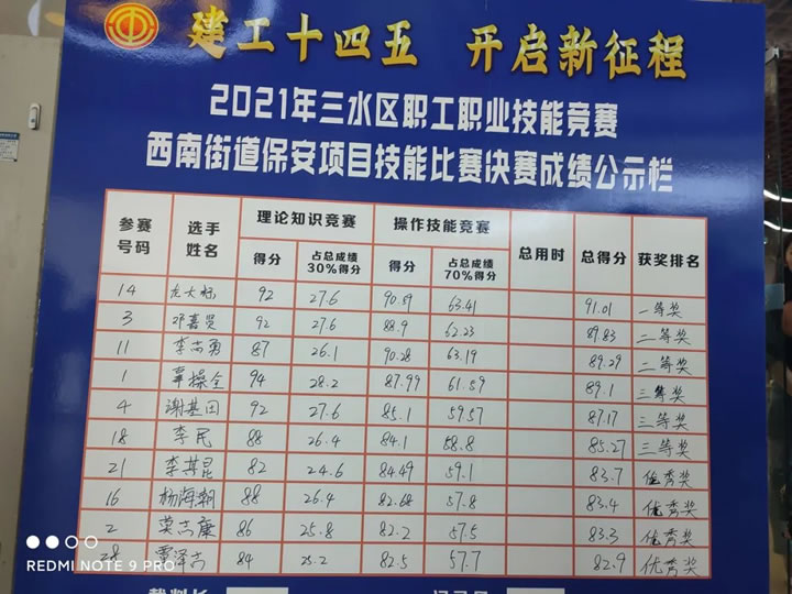 为搭建展示保安职业技能人才才能的平台,通过技能练兵、比武竞赛,培养一批爱国敬业、技艺精湛、具有专门技能的人才, 进一步提升保安从业人员的安全服务技能,推动行业整体服务水平的不断提高。9月29日, “建功十四五 开启新征程” — 2021年三水区西南街道保安员职业技能竞赛在水都基地职工服务中心举行。该竞赛由佛山市三水区总工会、西南街道总工会主办,共有12家单位28名保安员选手参赛,我司代表参赛选手龙大标、邓嘉贤、李志勇、辜操全、李其昆、杨海潮分别获得一等奖、二等奖、三等奖、优秀奖。