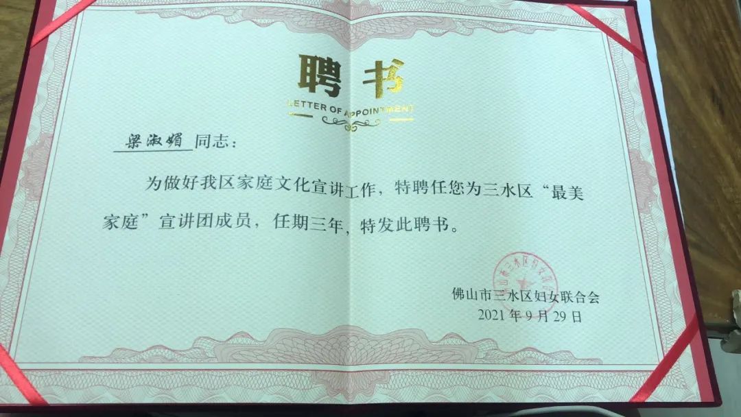 座谈会上,区妇联还对三水区第二批“最美家庭”宣讲团成员颁发了聘书,希望区内的“最美家庭”宣讲团成员可以发挥示范宣传引导、示范引领的作用,引导广大家庭发扬尊老爱幼、男女平等、夫妻和睦、勤俭持家、邻里团结等中华民族传统美德,以良好的家风促进社会和谐。