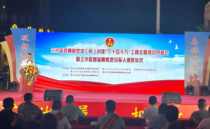 8月29日晚,佛山市三水区双拥模范城(县)创建“个十百千万”工程主题活动月启动暨三水区首届最美退役军人颁奖仪式,在三水万达广场举行。