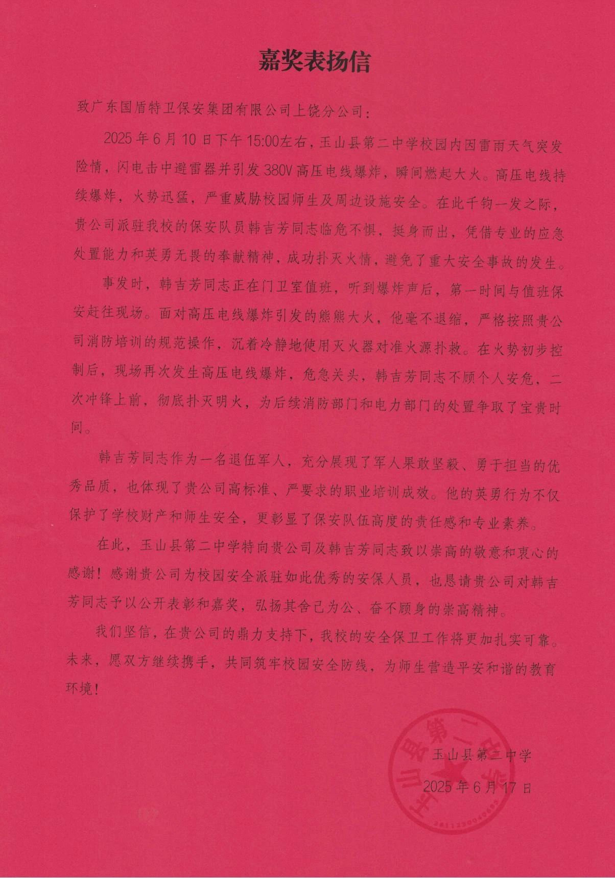 2025年6月10日15时,一场突如其来的危机打破了江西省上饶市玉山县第二中学的宁静。受强雷雨天气影响,校内避雷装置遭雷击引发380V高压电线剧烈爆炸,火焰裹挟着浓烟瞬间吞噬了供电线路。在这危急时刻,集团上饶分公司驻校保安员韩吉芳同志临危不惧、挺身而出,用果敢的行动诠释了责任与担当,谱写了一曲新时代的英雄赞歌。