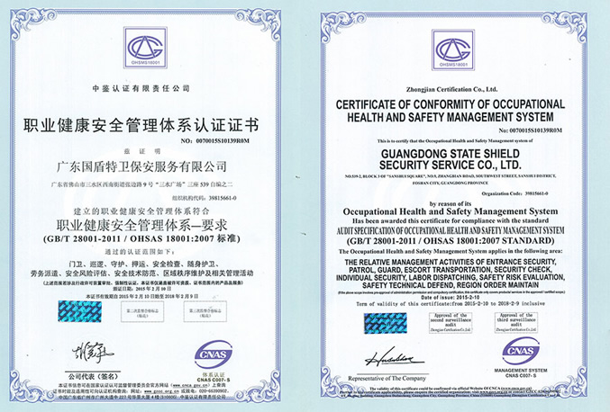 职业健康安全管理体系认证证书